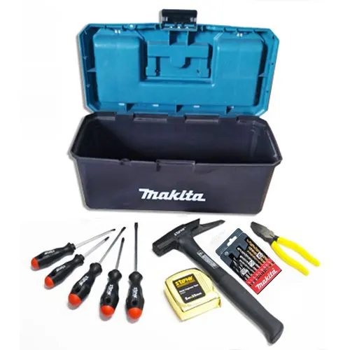 1 قطعة زردية ستونى ، 1 قطعة مجموعة لقم مثقاب ماكيتا ، 1 قطعة مطرقة ستونى متعددة الوظائف ، 1 قطعة شريط قياس ستونى ، 1 قطعة مجموعة مفكات براغي ستونى ، 1 قطعة صندوق أدوات ماكيتا.