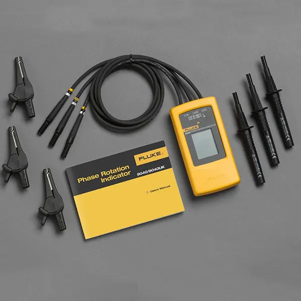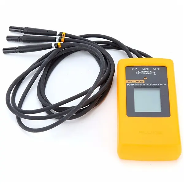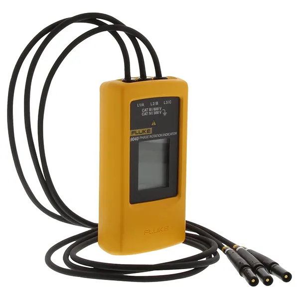 Split in 4 payments of The Fluke 9040 Phase Rotation Indicator is a portable handheld instrument designed to detect the rotary field of three-phase systems. With three test leads, this rugged tester easily determines a clockwise or counterclockwise direction. The Fluke 9040 Phase Sequence Tester is a phase rotation indicator with high voltage capability for industrial applications. The Fluke 9040 is effective for measuring phase rotation in all areas where three phase supplies are used to feed motors, drives, and electrical systems. The Fluke 9040 is a rotary field indicator and can provide a clear indication of the 3 phases via an LCD and the phase rotation direction to determine correct connections. It allows rapid determination of phase sequence and has a voltage (up to 700 V) and frequency range suitable for commercial and industrial applications.