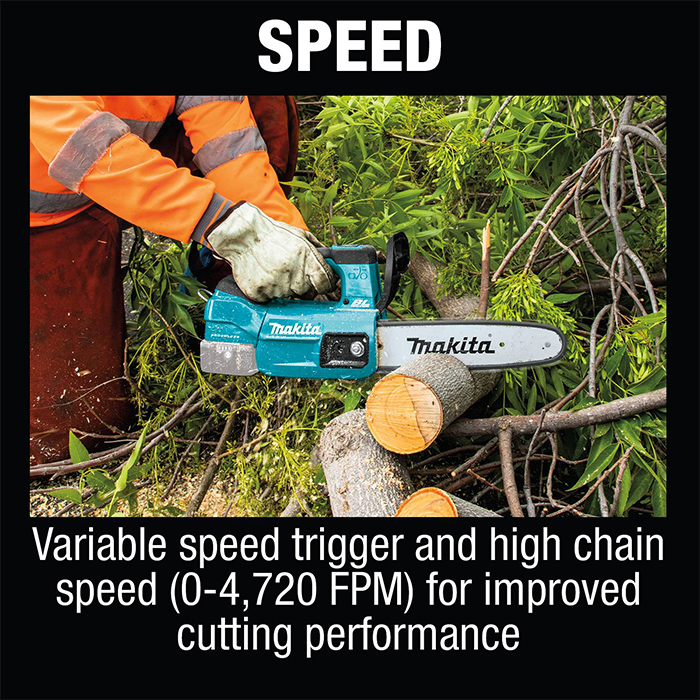 The Makita DUC254 top handle chainsaw is a lightweight (2.0kg) top handle chainsaw with a fast chain speed of 0 - 24m/sec making it the ideal choice for single-handed pruning. The brushless motor draws less power from the battery meaning the longer run time of up to 30% per charge, cooler running operation, and no maintenance, and the variable speed trigger has a soft start for more accurate cutting. Other features include an electric chain brake, chain oil adjustment with a level display, a hanging hook, and an auto power-off function. This cordless top handle chainsaw is a fantastic professional unit being both lightweight and powerful and is ideally suited to trained tree surgeons and must be used with safety equipment including eye, hand, and foot protection