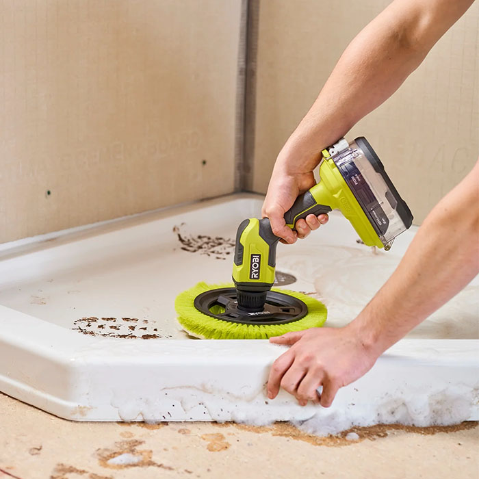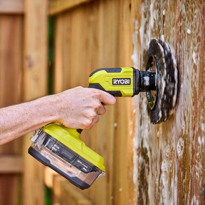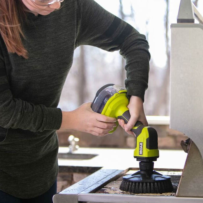 Compatible with Ryobi interchangeable brush accessories, enabling cleaning on various surfaces with different bristle options.