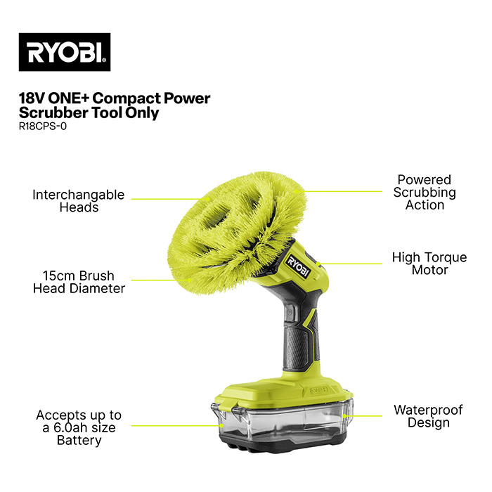 Split in 4 payments of The Ryobi R18CPS-0 Cordless Cleaning Scrubber is a compact yet powerful solution designed to remove stubborn dirt and grime with minimal effort. Powered by the Ryobi 18V ONE+™ battery system, this cordless scrubber delivers reliable performance without the inconvenience of power cables. Featuring a 15 cm round brush head rotating at 210 RPM, it provides efficient cleaning across a wide range of indoor and outdoor surfaces. With an IPX7 waterproof rating, the R18CPS-0 is fully protected for wet cleaning tasks, making it ideal for bathrooms, kitchens, garden furniture, BBQs, and vehicle wheels. Lightweight, ergonomic, and versatile, this cordless cleaning scrubber simplifies demanding cleaning jobs.
