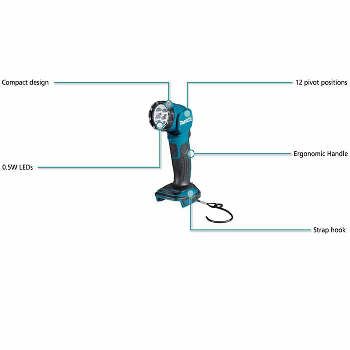 The Makita DML815 18V LXT LED Flashlight delivers bright illumination, versatility, and convenience. The high-luminance 4 LED flashlight provides 160 lumens. The 12-position aluminum pivoting head provides added versatility, with a durable design engineered for job site conditions.