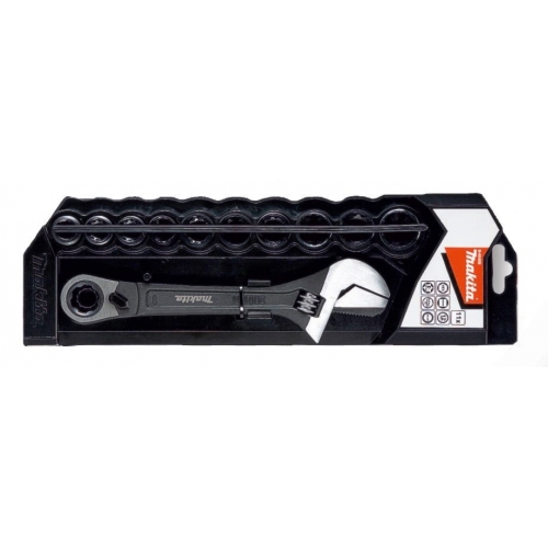 The Makita 11 Piece Pass Thru Adjustable Wrench Set contains 10 pass thru sockets in the following sizes & a 200mm pass thru adjustable wrench. The Pass Thru Sockets work on 6-point, 12-point, square, E-T, spline & partially rounded hex fasteners.
