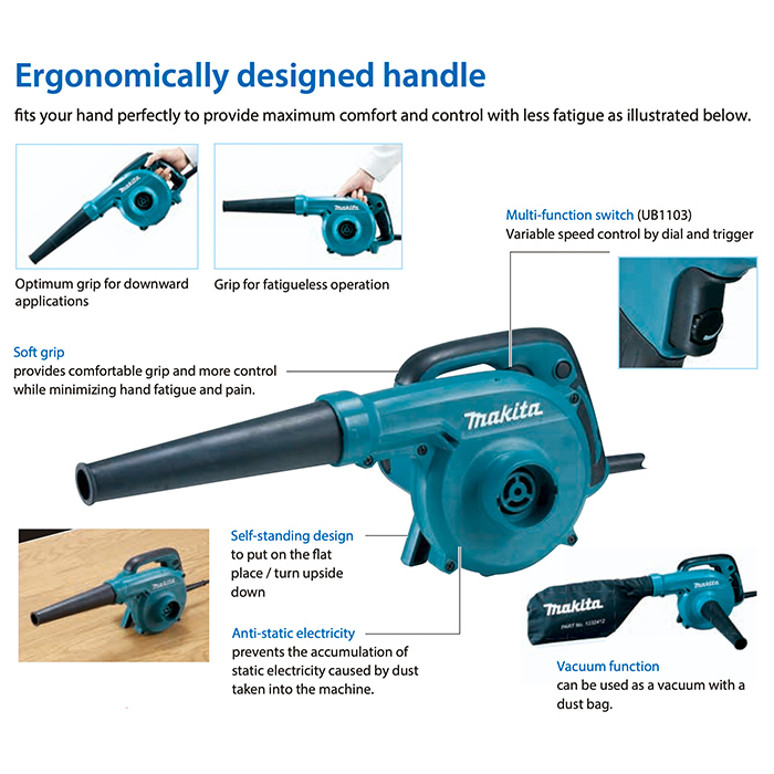 Split in 4 payments of Makita UB1103 is a portable air blower with variable speed control for a fast cleaning on the job site or in the workshop.