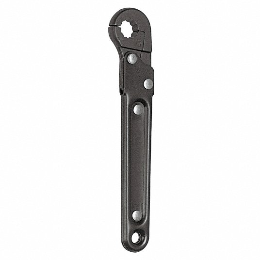 • The ratcheting wrench head allows a line or other obstruction to pass through it, then closes for full contact around the fastener.