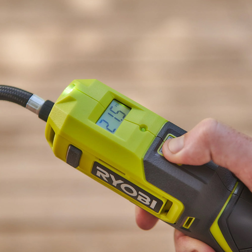 Split in 4 payments of Ryobi USB Lithium™ Cordless Inflator, RI4-0, is designed to provide quick and convenient inflation for everyday needs with a compact and portable solution. Delivering up to 100 PSI, this lightweight tool is ideal for inflating bike tyres, sports balls, and other small inflatables with precision and ease. The USB Lithium™ Cordless Inflator features a backlit LCD display that shows real-time pressure readings, allowing users to monitor and adjust inflation accurately. With a detachable hose, built-in accessory storage, and integrated work light, this cordless inflator offers flexibility, visibility, and control in a variety of environments.
